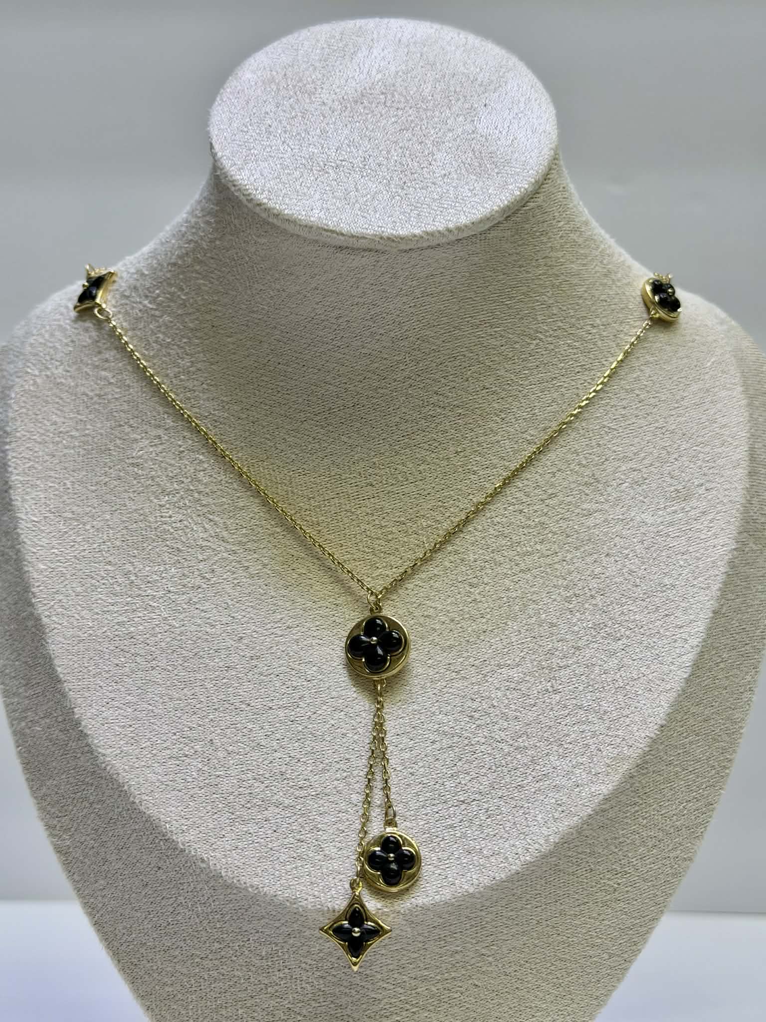 Turn heads with this beautifully crafted gold-tone drop necklace featuring stunning black clover-inspired accents. Designed for effortless elegance, this piece combines delicate detailing with bold contrast for a look that’s both modern and timeless.
