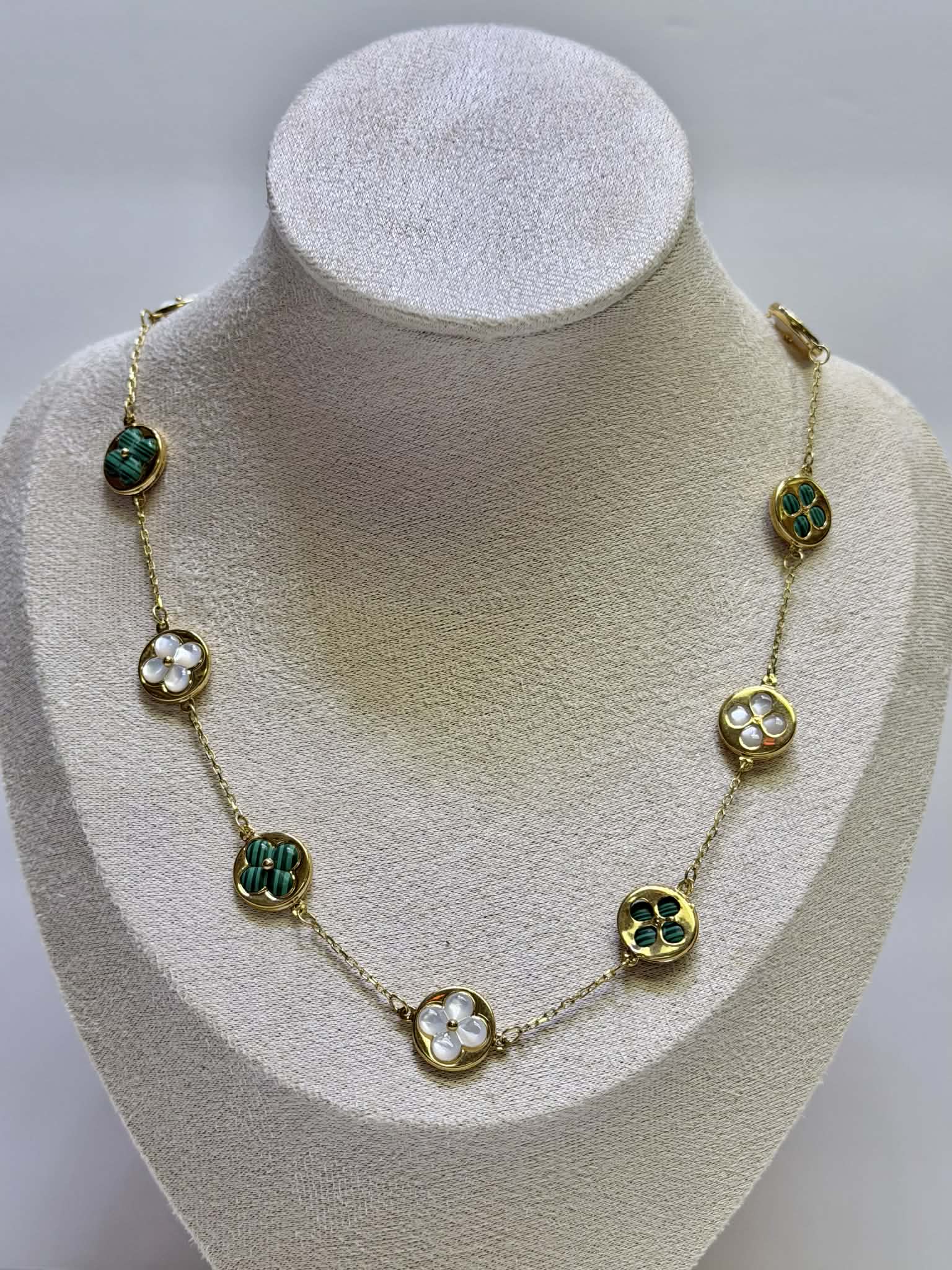 Alternating round clover charms in rich green and classic white