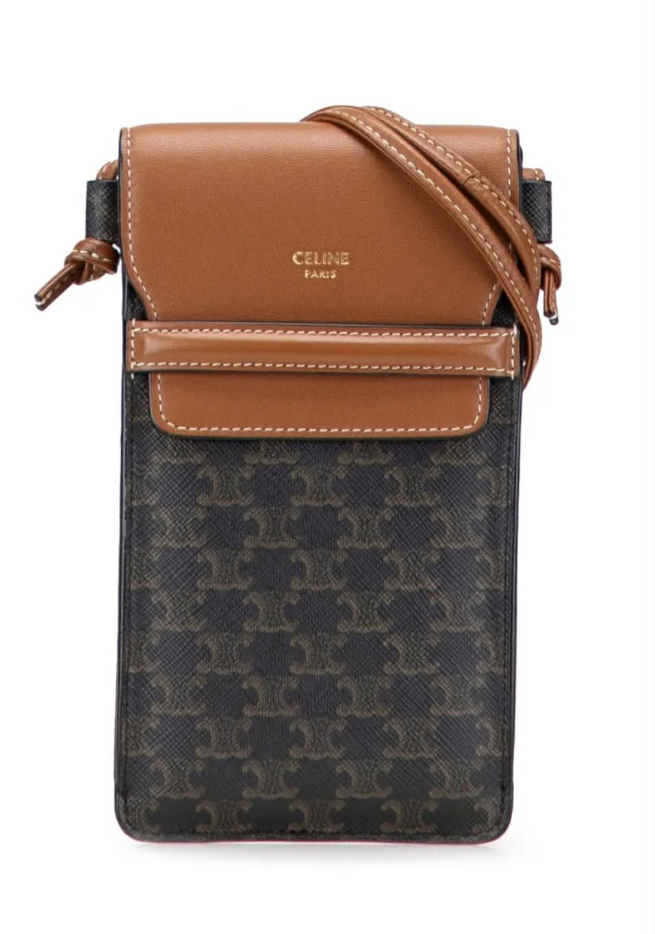 Its slim, compact design is perfect for holding your phone and small essentials, while the adjustable strap allows for comfortable crossbody wear. The refined stitching and signature CELINE PARIS logo add a sophisticated touch, making it a stylish accessory for both casual and dressed-up looks.