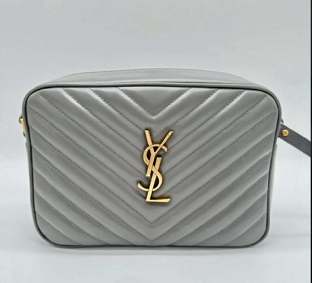 Timeless, elegant, and effortlessly chic, this Saint Laurent YSL Camera Bag in classic gray is the perfect luxury accessory for everyday wear. Crafted from soft chevron quilted leather, the bag is highlighted by the iconic gold-tone YSL monogram on the front, creating a sophisticated and instantly recognizable look.